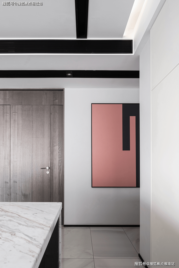 餐厅视角尽头是中厨,利用了隐藏式推拉门设计阻挡了油烟,内部整体色调依然以黑白为主。过道墙壁精心设计为收纳空间,最大限度地利用了每一块空间增强收纳功能。