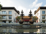 本案的色调借鉴「希腊安缦卓熠」、「Gundari度假村」,但示范区的建筑形制风格偏「曼谷湄南河四季」,在局部细节之处还依稀能够感受到「杭州仁恒滨江园」、「杭州古翠隐秀」的影子,比如景墙、围墙采用虚实结合的表达方式,又如人行出入口处水景、水院的设计等等;