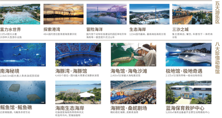 · 由迪斯尼策划公司——加拿大FORREC公司担纲设计、原迪士尼《狮子王》主创打造原创IP形象,分为五大游乐区、八大动物场馆及星级酒店群,拥有40多套国际顶级游乐设施,以及1500余种4万余只海洋生物。