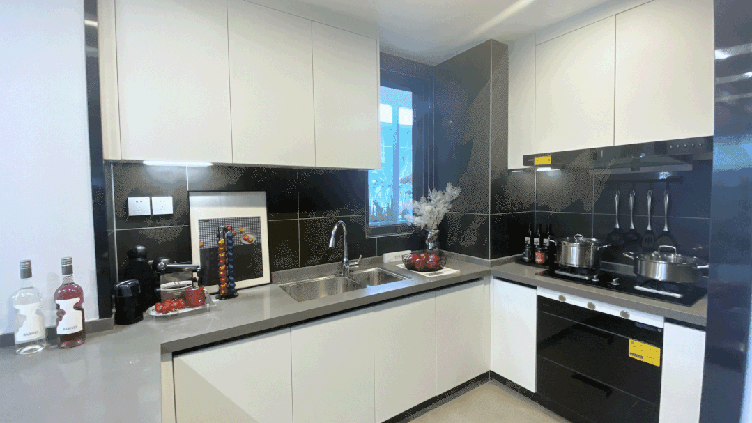 在推拉门打开的时候,定制中厨台可瞬间变为西厨岛台,佐餐备餐,围坐聊天,“传统”的中厨无缝切换为开放式的家庭社交中心。同时引入智能家电丰富了空间的层次变化,也重新定义了新生活态度人群对厨房的传统认知。