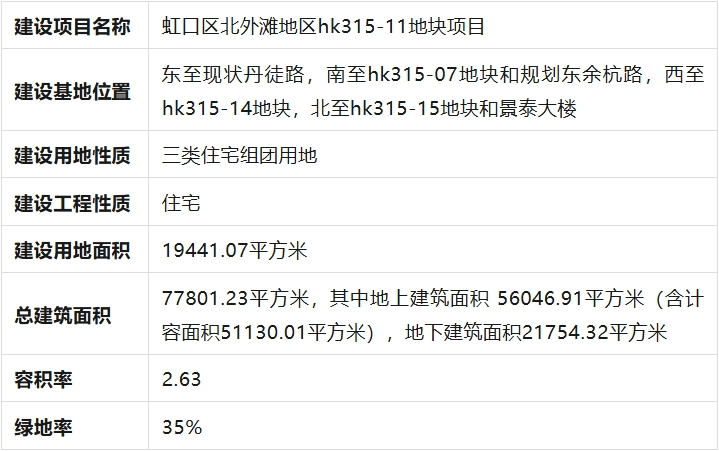 虹口北外滩地区hk315-11地块新建住宅项目,位于虹口区北外滩核芯区,东至现状丹徒路,南至hk315-07地块和规划东余杭路,西至hk315-14地块,北至hk315-15地块和景泰大楼。总建设用地面积约19441平方米,计容建筑面积约51130平方米。