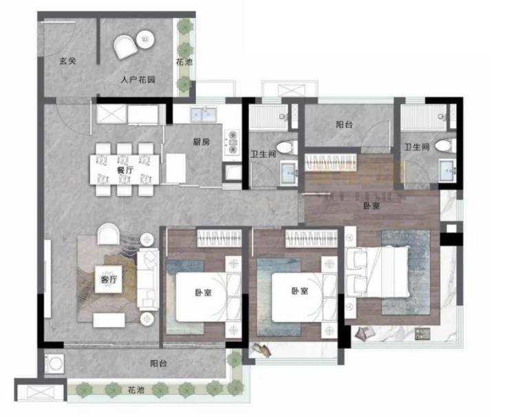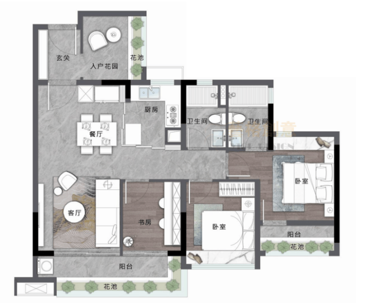 功能性下沉地下室:在后勤路线专设快递/垃圾处理空间,提供舒适、健康的居所环境。