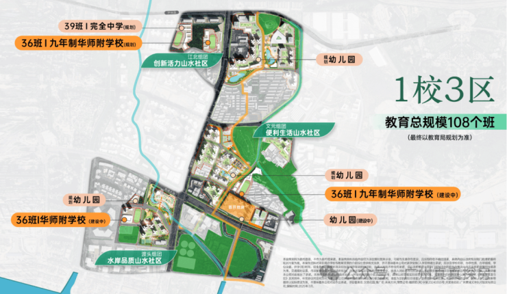 江北组团,配备一所36班的9年一贯制和39班的初高中