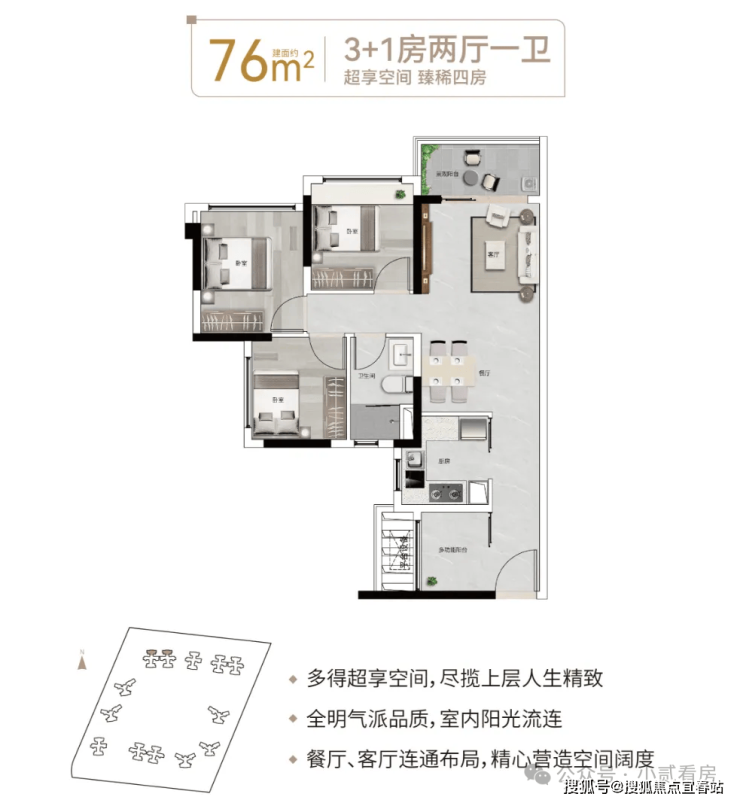 【76㎡3+1房2厅1卫】餐厅、客厅连通布局,低总价晋阶天河