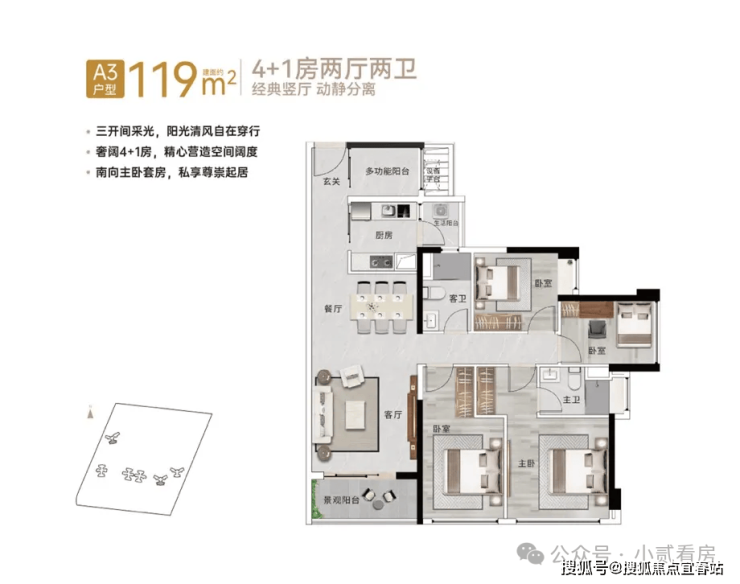【88㎡3+1房2厅2卫】经典竖厅格局,三开间采光,近11㎡主卧套房设计,稀缺小户型,低总价晋阶天河
