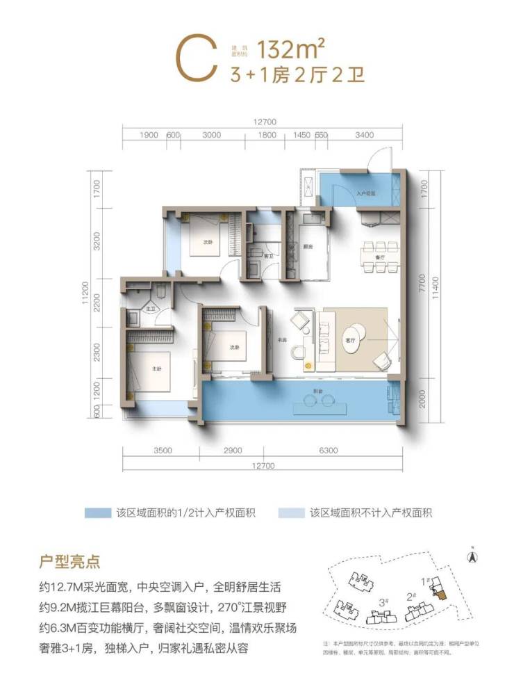 2. 一线江景+3.1容积率纯板楼,107-132㎡宽幕三房/四房,户户看江。灵活户型,满足刚需与改善多重需求,空间利用率高