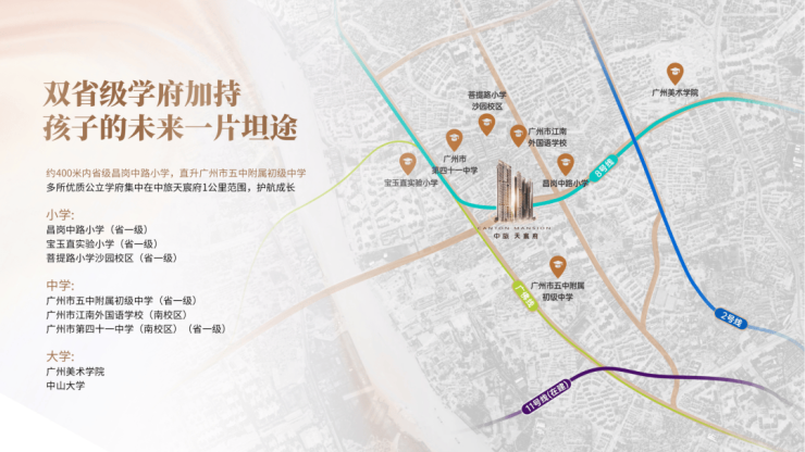 项目位于海珠区最强教育板块,项目所属沙园街橡胶新村社区,直接对口省一级昌岗中路小学(500米左右的距离),中学电脑派位,有广州市五中附属初级中学,南武中学等等。