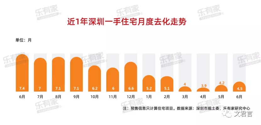 从近一年去化周期来看,跌势明显,到6月份去化周期依然只有4.5个月,这说明深圳一手住宅供不应求情况在加剧。