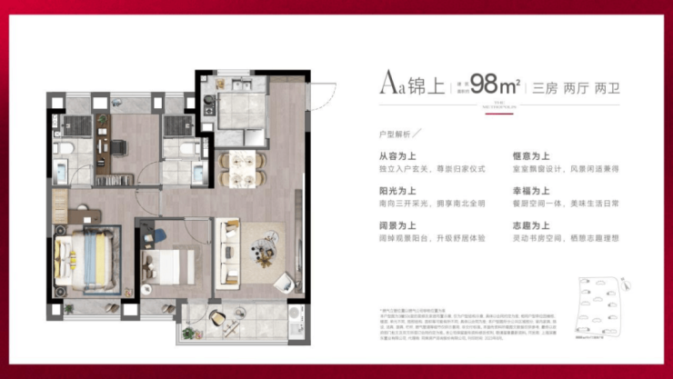 98m²的户型还做了两卫设计,舒适方便,晨起再也不用经历排队洗漱的局促局面,亮点满满!
