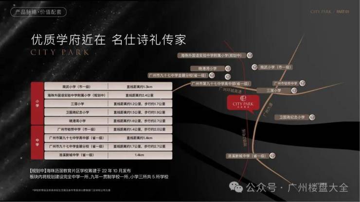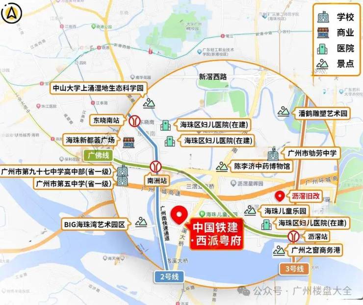 3、教育:项目周边直线距离约1.3km是南武小学(市一级),直线距离约 1.5km是广州市劬劳中学(市一级) ,直线距离约1.4km是广州市第九十七中学高中部(省一级) ,直线距离约 1.4km 是洛溪新城中学 (省一级)。