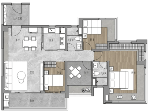 两个卧室没有承重墙限制,也方便后期更好地根据家庭成员变化改造户型。