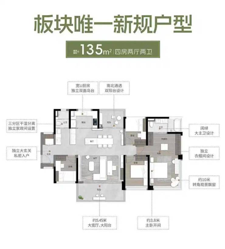 约135㎡户型,四房两厅两卫,南北通透双阳台设计,自带约5.25米大宽厅以及约5.45米大阳台,主卧开间约3.6米,已经快追上不少紧凑三房的客厅开间了!