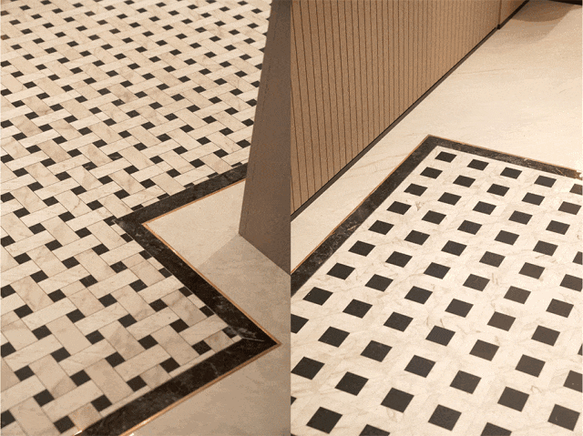 卫生间砖群“九缝归一”,你会发现,地面、墙裙、墙壁的砖缝,都能衔接上,观感愉悦。