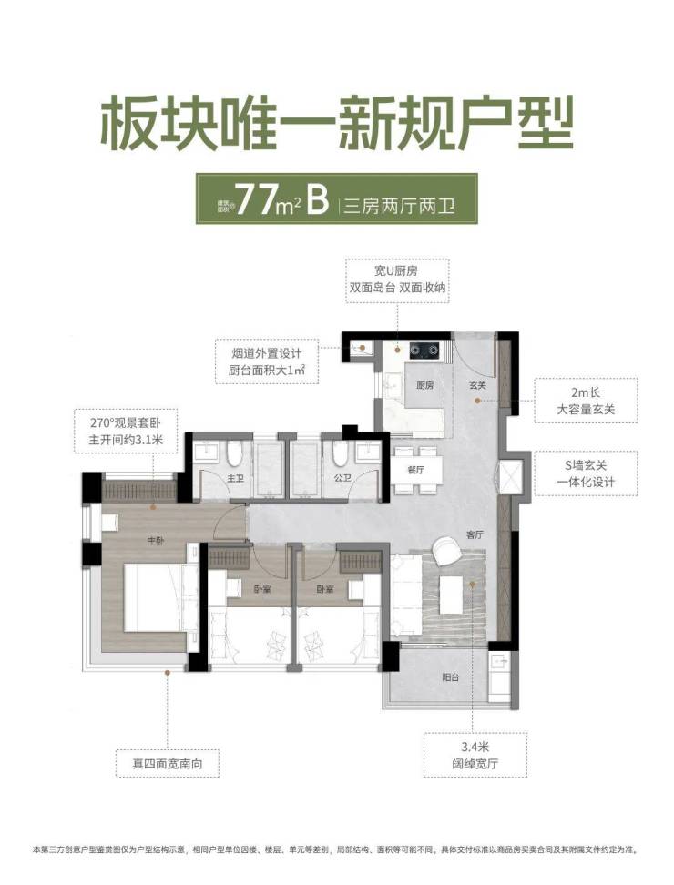 77平A户型,三房两厅两卫;