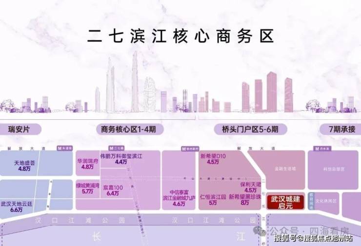 二七滨江商务区分7期开发,1-4期商务核心区由SOM、AECOM、NIKKEN、CBRE等统一规划;5-6期桥头总部门户区由ASGG、CBRE等统一规划;未来7期承接金融商务区与长江新区