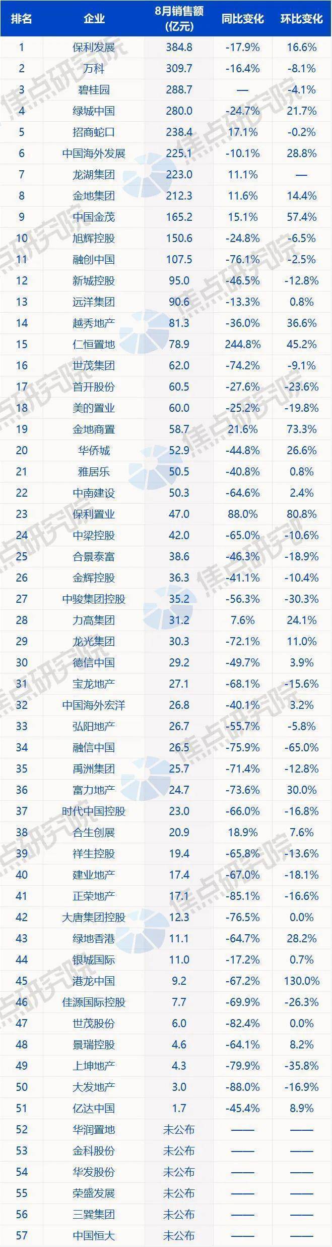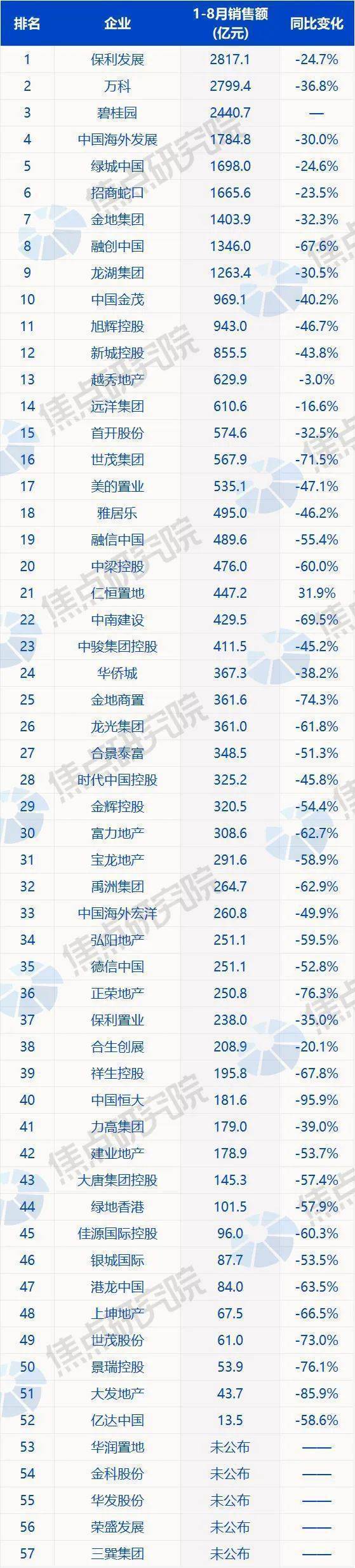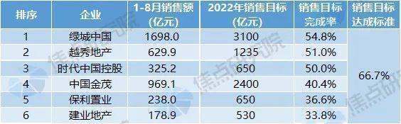 2022年1-8月上市房企销售额排行榜(持续更新中)