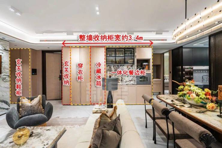 客厅进门处更是打造了整墙收纳柜长度约3.4m,包括穿衣柜、冷藏冰箱、玄关收纳,甚至过道还有玄关收纳柜,完美收纳各类衣物包包毫无压力;