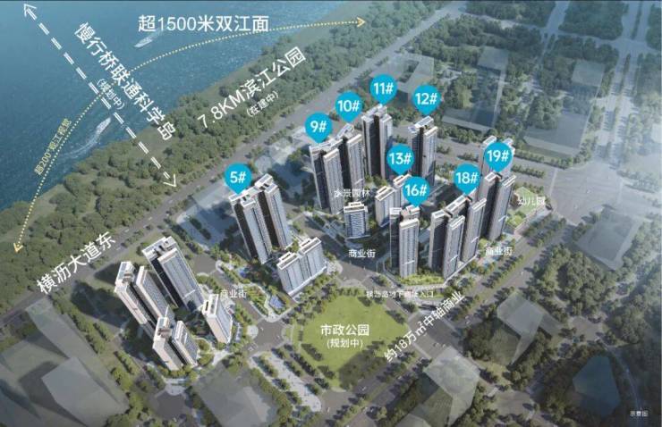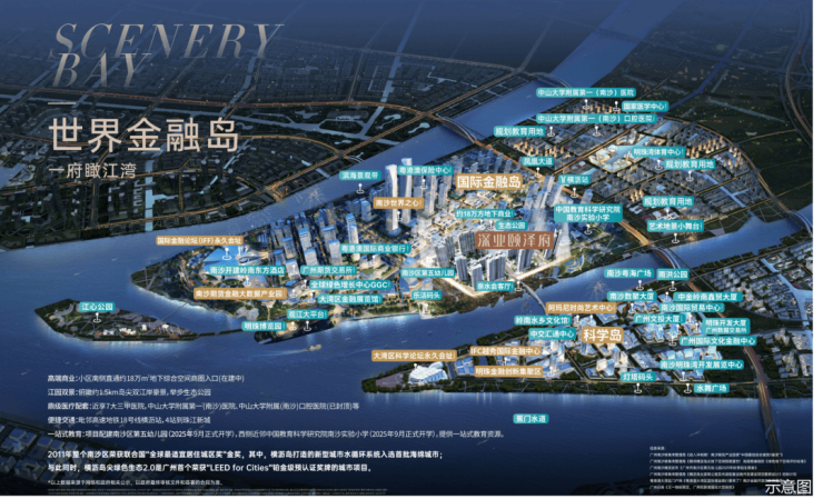 为实现大湾区城市会客厅的畅联,项目北侧打造过江人行桥(规划中),东侧打造过江隧道,实现明珠湾金融岛、科学岛的双岛资源共享,打造湾区中央商务区;深业颐泽府作为国际金融岛唯一“府”系备案项目,坐拥双岛繁华配套,实至名归的“岛中岛 世界府”。