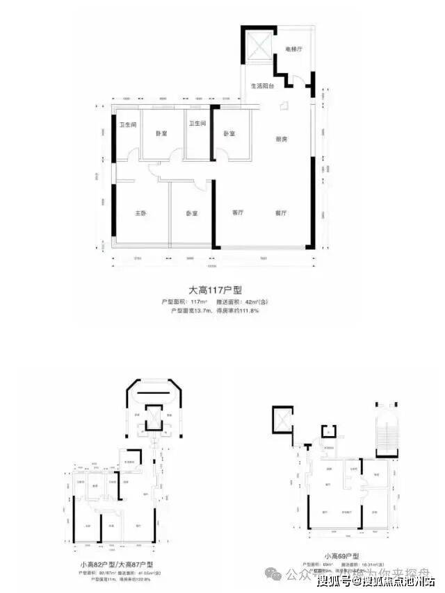 联发光合新澍户型图出炉,建面约69-82-87-117平。69平实得约107.5%,82平/87平实得约122.8%,117平实得约111.8%.户型图如下。