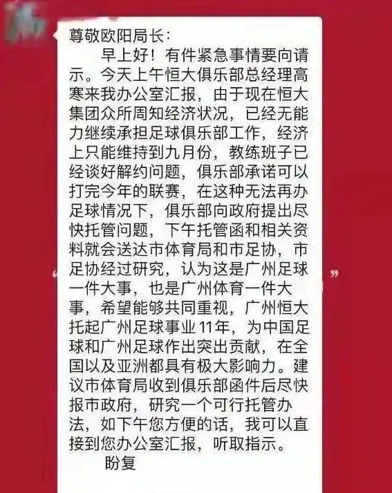 然而,仅仅一年半以后,网络上就流传着一张截图,内容是广州队向广州市足协和体育局提出了托管申请,将恒大撤离足球行业的可能,摆在了公众面前。而建了一半的莲花球场早已转手,志在百年树人的恒大足球学校也传出了闭校的风声。