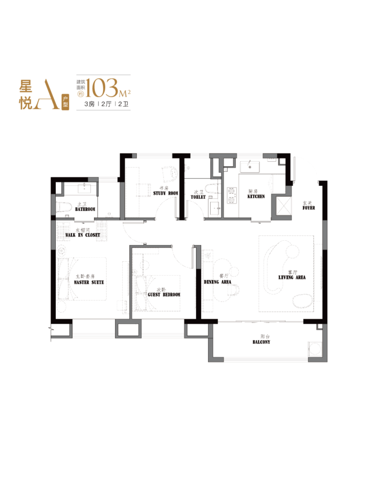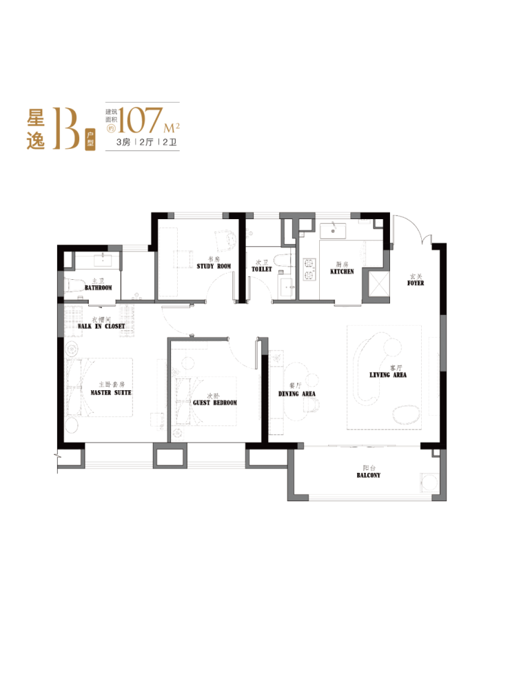 项目约103-107㎡3房2卫设计,有着宽绰的大横厅设计,并且3.5开间朝南。