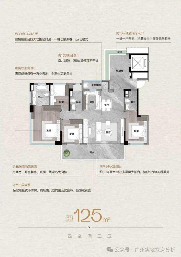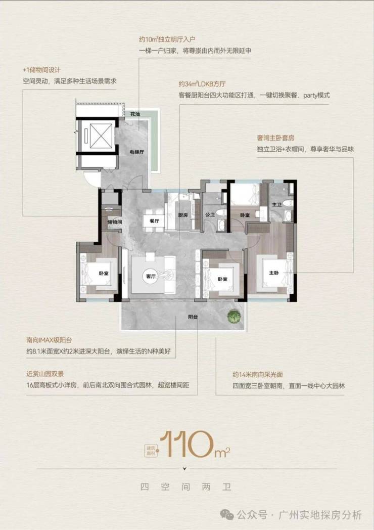 板式小洋房:建面约110-125㎡,一梯一户,专梯入户,拥有独立明厅、星级主卧套房、超大LDKB方厅,南北双阳台,使用率超130%,适合改善型家庭。