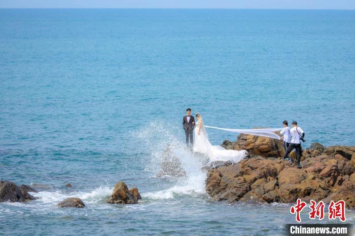 一对情侣在天涯海角景区海边礁石上拍摄婚纱照。 范勇 摄