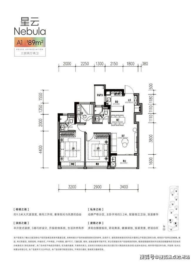 建面约89㎡的三房户型:朝南约9.5米大面宽+二房间朝南+约3.4米南向阳台+双飘窗设计。