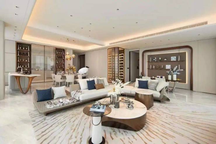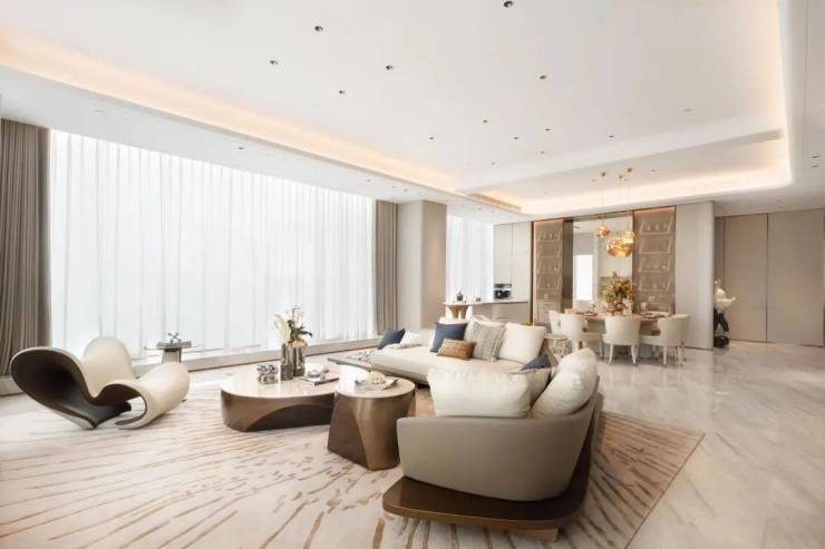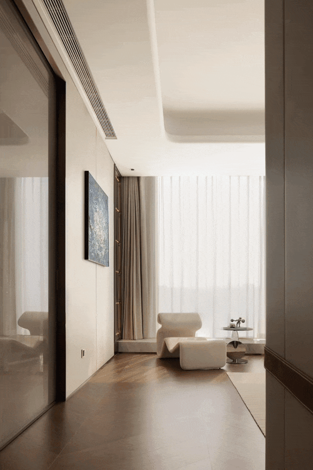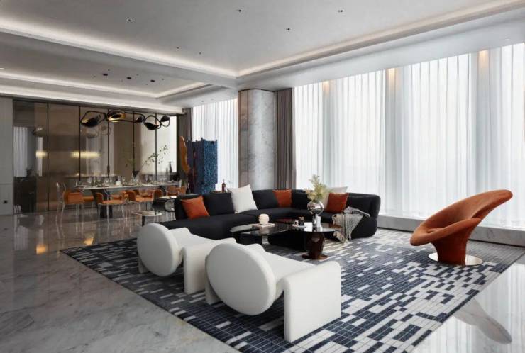 室内设计上,用现代的元素与艺术的视角,将简洁、丰富、有意境的场景氛围融入到居住空间中,兼具雍容典雅与实用主义,奢华但不浮夸,呈现出一种自由、洒脱而赋有品质的生活意境,简洁的空间,精致的摆件,塑造了舒适时尚的空间,奢雅之余也彰显了大平层的生活精髓与空间气度。