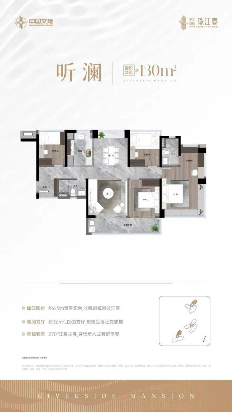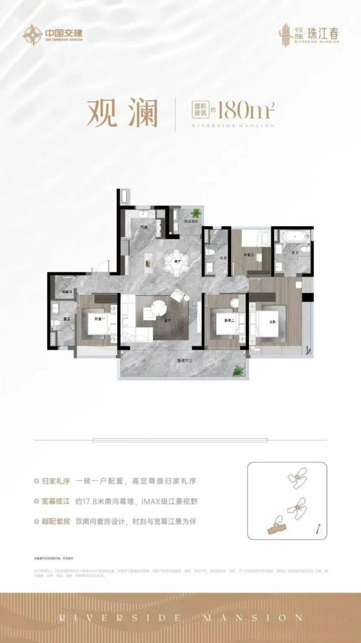 接下来看看户型。中交四航珠江春目前主推建面约 130 - 185㎡的南向瞰江臻品,户型设计充分考虑了居住的舒适性和空间的合理性。所有户型均为全南向,采用点状布局,并配备大面积玻璃幕窗,保证了充足的日照时间和良好的通风效果。