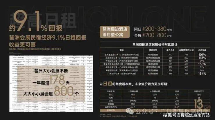 2023年琶洲展会全年举办800场,共178天,以会展租价计算,一年最高可达13万/年超高收益,民宿经济约 9.1%日租回报 更可喜。
