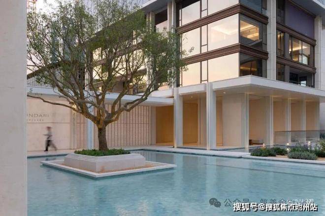 为此他们反复调试了水院底部的瓷砖颜色,以及水的深度,让它与纯色系的石材柱廊、立面,彼此呼应。同时,整个水系也用了和泳池类似的净水系统,不光要在销售阶段保持纯净,今后交付了,同样要打理得纯净透亮。