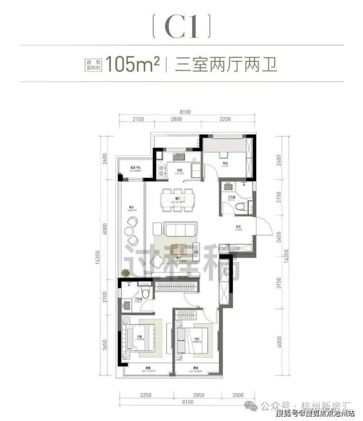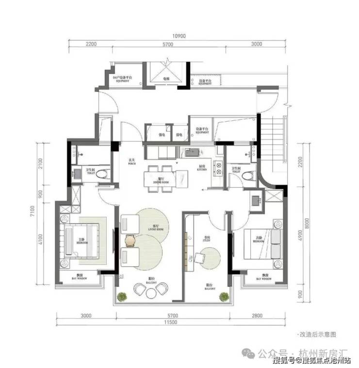 刚改旗舰边套户型:建面约114方四房两卫。