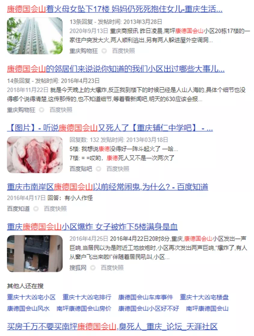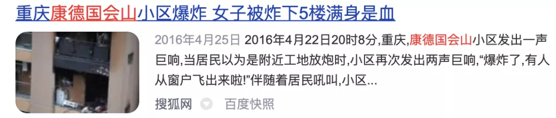 图源百度,不代表本号观点在输入“康德国会山”之后,弹出的关联词竟是“灵异事件”……难道真的是北有“上品拾陆”,南有“康德国会山”吗?都说“七星岗闹鬼,上清寺镇邪”,不了解还不知道,据说康德国会山是以前就是块坟地,所以才出了这么多的事情。不过最近的一个事情也是前几年的时候了,2016年康德国会山小区发生过一次爆炸。