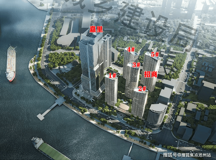 招商地块,一共5栋住宅,住宅高度42-45F,首层全架空,大概有588户,户均221m²。从效果图来看,流线型玻璃幕墙立面,大概率有270°转角观景窗,大门约52米宽,高层4F,4F配套会所看江泳池等,入户后就是户外的下沉庭院等,案名大概率是【招商长江序】,招商地块东南朝向,一线临长江,1、2号楼在第一排,看江无遮挡,对面为积玉桥。3号楼位于第二排,左右侧面还是会收到一定的视野遮挡,三排4、5号楼估计就是夹缝看江了。