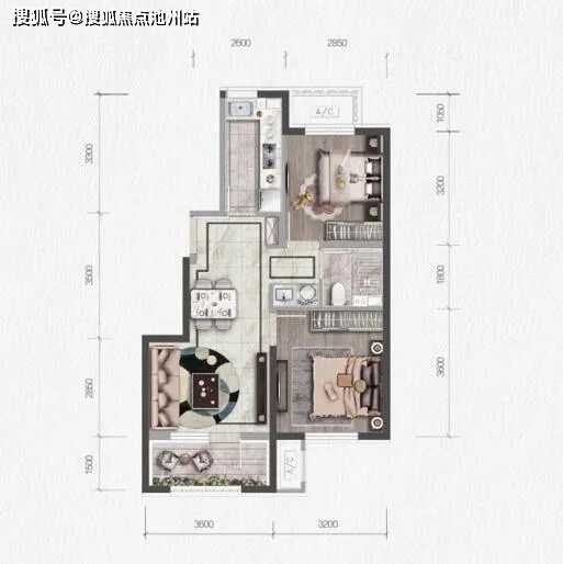 75平两室户型是典型的南北通透户型。卫生间干湿分离,南向阳台与客厅整体比较方正。