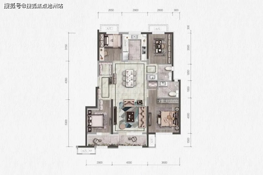 127平四室产品中间为厨房、餐厅、客厅、阳台的通透,四个卧室分别在四个角,动静分明,各个房间的私密度都比较强。同时主卧有套间设计,彰显了主人的尊贵感。