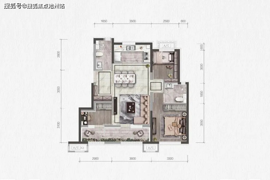 89平三室两厅两卫产品形成了主卧套间,这样的设计提升了业主的私密度;厨房、餐厅、客厅连为一体,增加了可利用的面积,同时南向拥有9.8米面宽,约6.5米的大阳台,光线十足。
