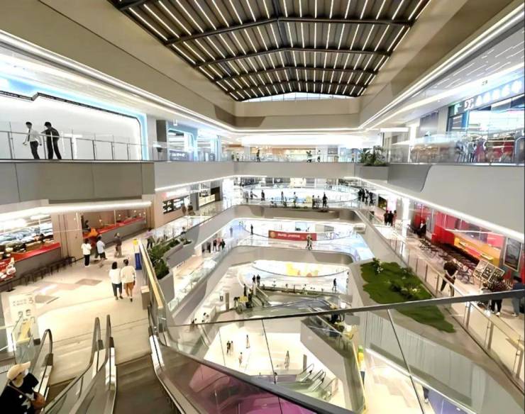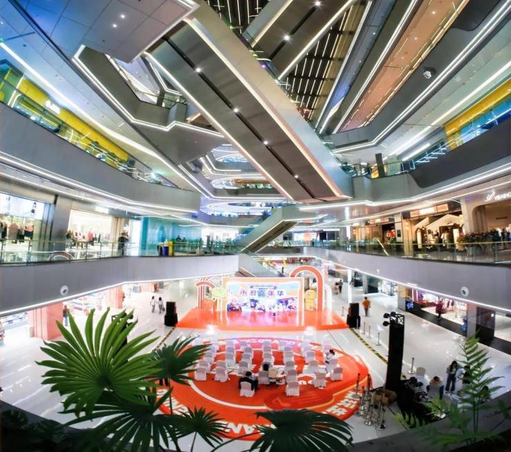 规划原有中庭空间设置有幕墙,走道环境封闭,视野不够开阔,将玻璃幕墙拆除,打开视线,让空间更敞亮。拆除后形成室外街区,夏季冬季气候不利商场运营,也不利于节能,于是在顶部增加活动遮阳棚,这样满足了建筑、消防等相关规范,同时构建了一个室内舒适又开放的空间环境。