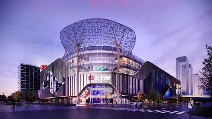 商业MALL采用超现代主义建筑设计风格,以时尚现代曲线铝板和玻璃组合为整体造型基调,顶部扩大曲线天幕遮阳造型,出入口增设超大LED屏幕,同时增加IP, 凸显时尚标志性的立面效果。线性LED灯带嵌入幕墙,夜间形成缤纷的灯光效果。以过街天桥连接商场和街区,加强南北区的交通联系。对商业屋顶设备增加格栅进行美化,提升第五立面效果。