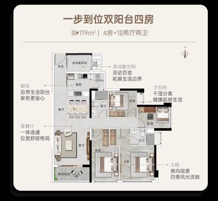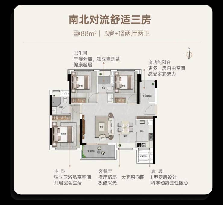 3开间布局,客餐空间一体化,配备约14㎡的奢阔主卧套间,+1创意空间,赋予房屋超高的适用性与成长性。