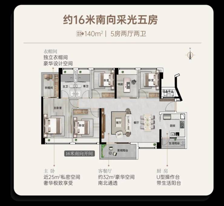 五房设计让多胎家庭每个孩子都有独立空间,约25㎡主卧套房让家长与孩子互不干扰。