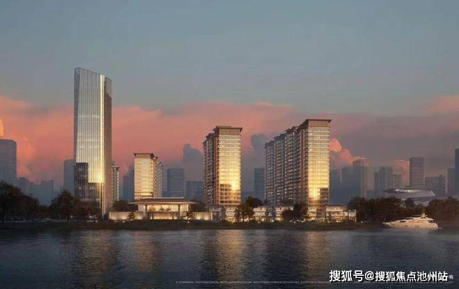 建筑立面以观澜屏玻璃立面辉映江水波澜与天际浩瀚,香槟金格栅是鎏金显贵,黄金缕线条流畅灵动,新中式韵律之美点缀CBD天际线