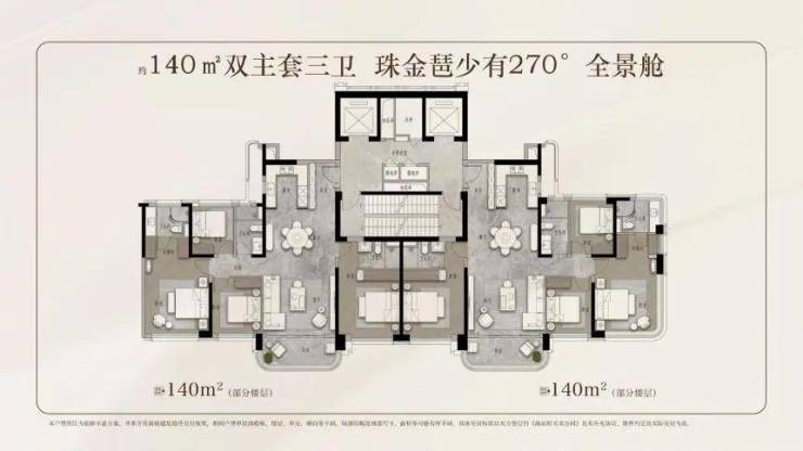120㎡四房,采用 270° 弧形落地窗设计,主卧套间配备独立衣帽间,实际使用率超 105%,剩余房源集中在中低楼层。