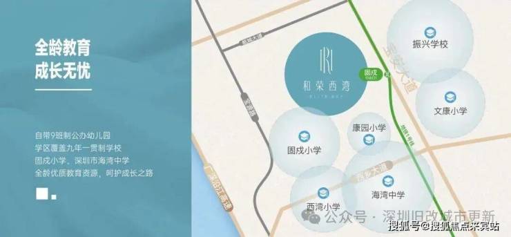 项目自带9班制公办幼儿园,学区覆盖九年一贯制固戍小学、深圳市海湾中学。