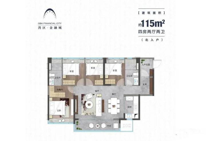 湾区金融城还提供了建面约115平方米的四居室户型,这个户型的特点是四房格局,非常适合二胎家庭。