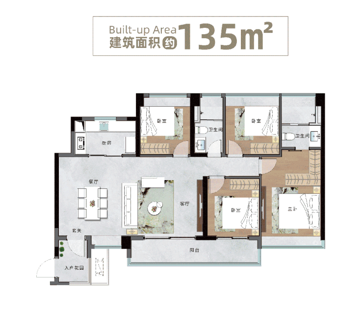 湾区金融城还提供了建面约135平方米的四居室户型,这个户型能够一步到位地改善居住条件。