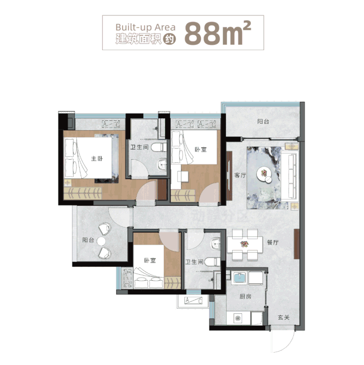 湾区金融城还提供了建面约88平方米的爆款户型,这个户型实现了3房+1灵动空间的设计,非常实用高效。