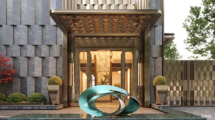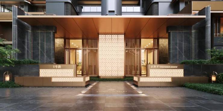 复刻和平饭店酒店式门庭,引入酒店式双线归家仪序,五进入户礼序与四重车仪之道,置身于海派隐奢的世界。高定酒店式落客区,尊奢入口,以国际顶奢酒店华尔道夫安曼式礼序营造,尽显尊贵风范。