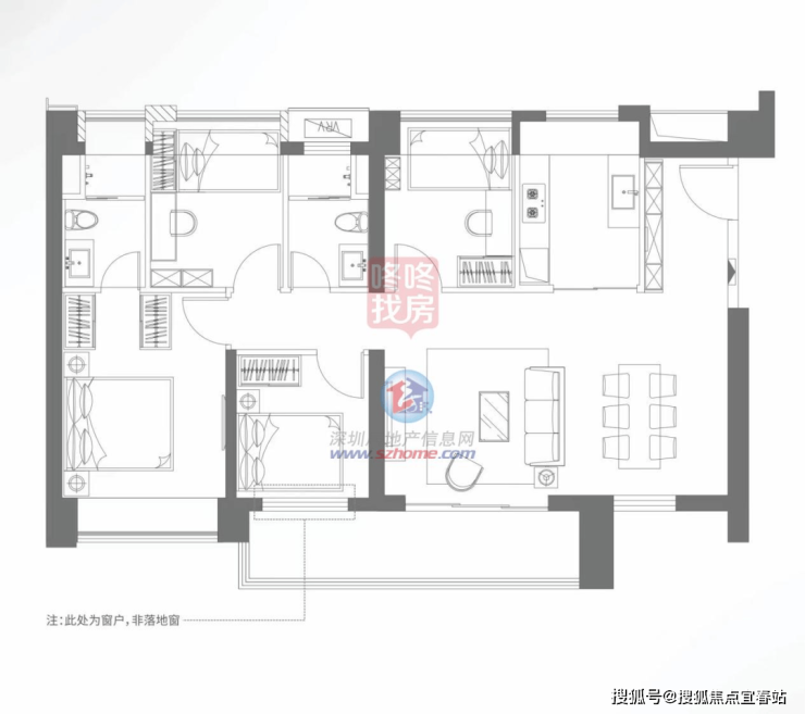 四房的D1,D2户型基本格局相同,采用客餐厅一体化设计。两者差别主要体现在,餐客出阳台,或是阳台延伸卧室窗户外。
